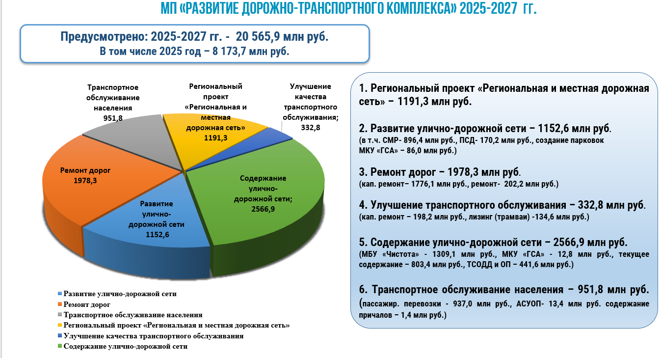 Председатель комитета развития дорожно-транспортной инфраструктуры Антон Романов отметил, что цель программы - развитие современной, эффективной и безопасной транспортной инфраструктуры города. На исполнение мероприятий программы предусмотрено в 2025-2027 гг. 20 565,9 млн руб., в том числе 2025 год – 8 173,7 млн руб.