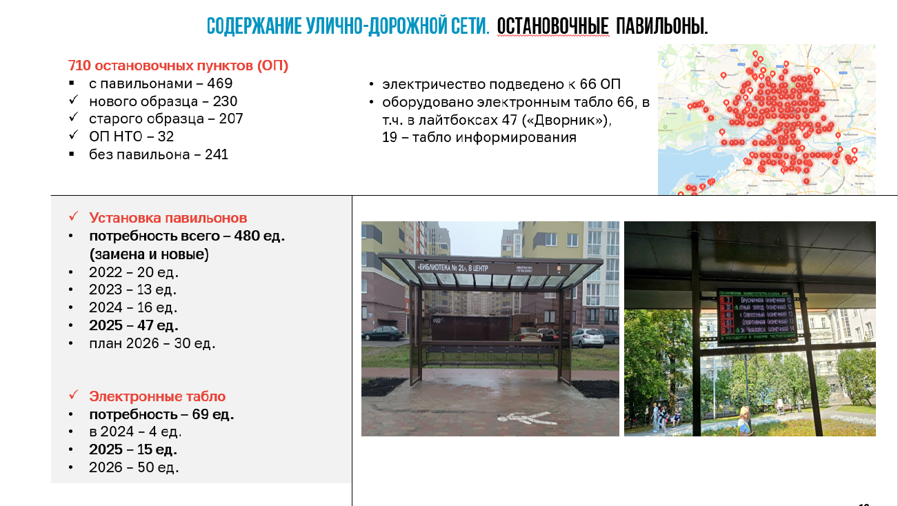 На приобретение и установку остановочных павильонов в 2025 году предусмотрено 60,8 млн руб., заключено контрактов на установку 47 единиц в 2025 году. Количество установленных павильонов увеличилось на 187,5% в 2025 году по сравнению с 2024 годом. Ведется работа и по обустройству остановочных комплексов электронным табло.
