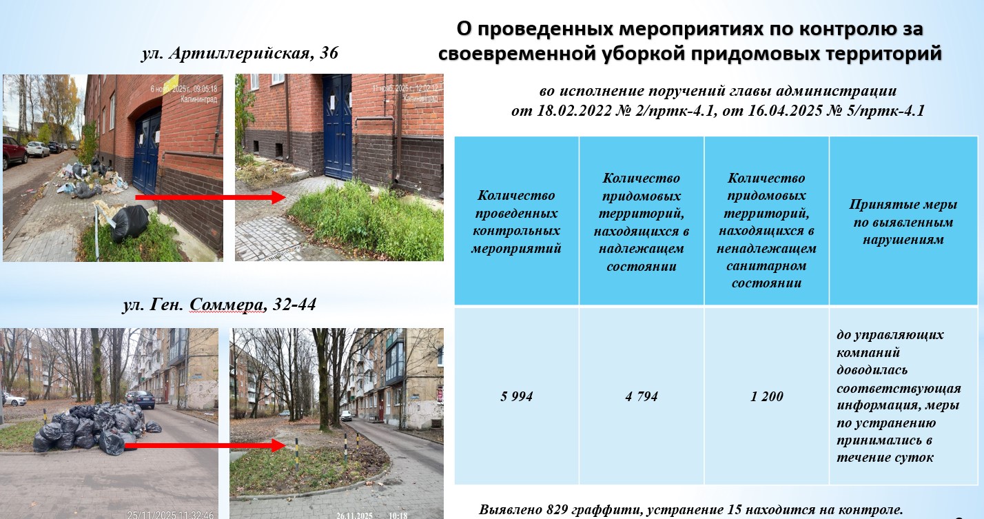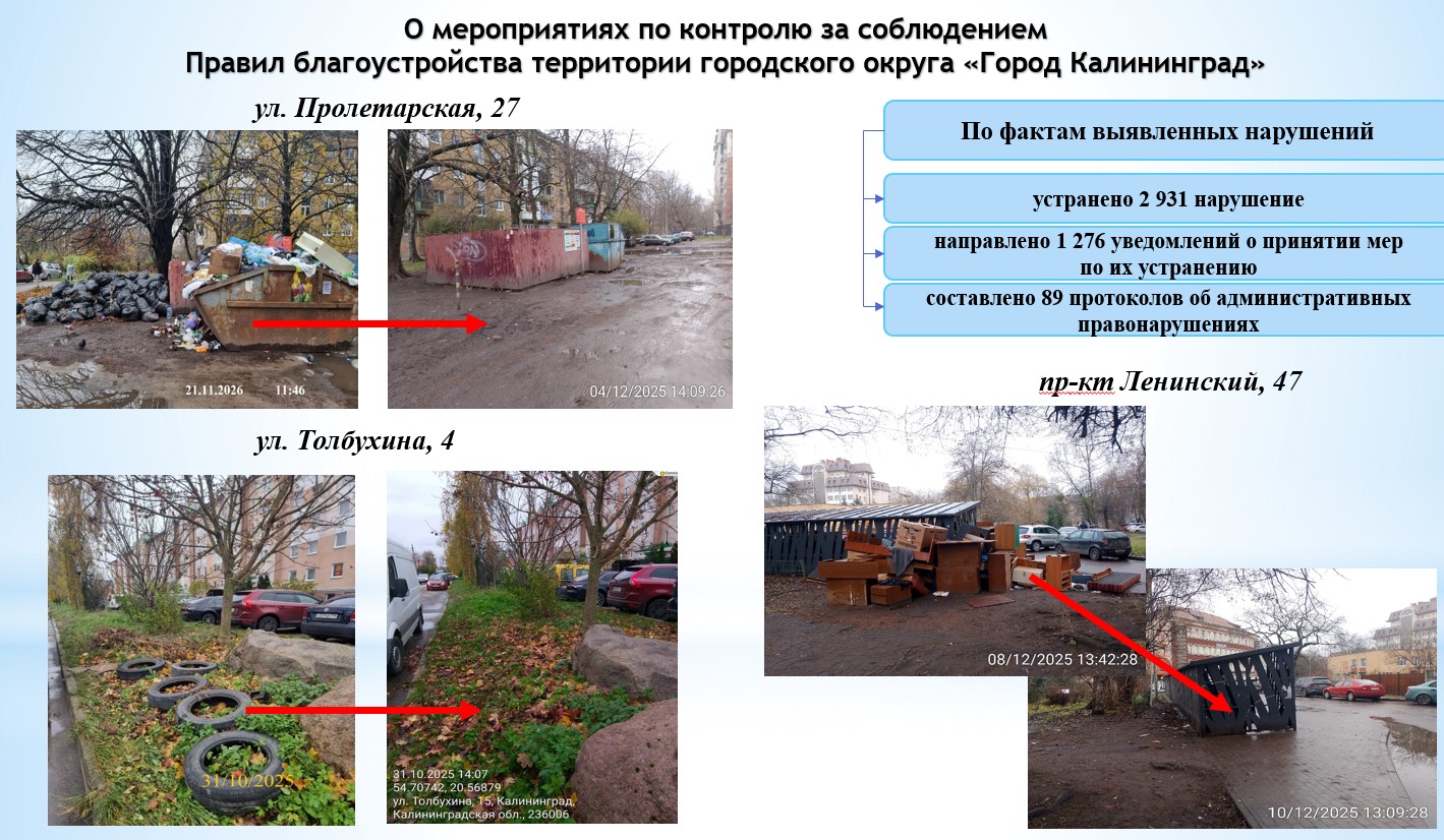 В ходе обследований улиц Калининграда было обнаружено 151 транспортное средство, признанное брошенным. 91 из них собственники добровольно переместили, а 36 в настоящее время находятся на спецпункте временного хранения. Также сотрудники муниципального контроля выявили 1 200 придомовых территорий, находившихся в ненадлежащем санитарном состоянии. Информация о нарушениях незамедлительно доводилась до управляющих компаний, благодаря чему меры по устранению принимались в течение суток.