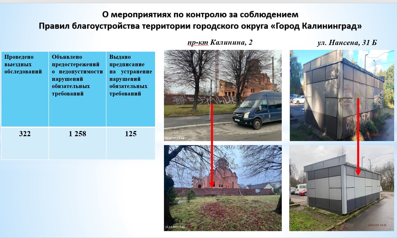 23 декабря на оперативном совещании под руководством главы администрации Калининграда Елены Дятловой председатель комитета муниципального контроля Константин Габичев представил отчёт о мероприятиях по контролю за соблюдением правил благоустройства городской территории.