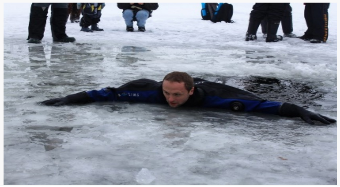 Раскиньте руки в стороны и постарайтесь зацепиться за кромку льда, придав телу горизонтальное положение. Зовите на помощь: «Тону!». Попытайтесь осторожно налечь грудью на край льда и забросить одну, а потом другую ногу на лед. Если лед выдержал, перекатываясь, медленно ползите в ту сторону, откуда пришли, ведь там лед уже проверен на прочность.