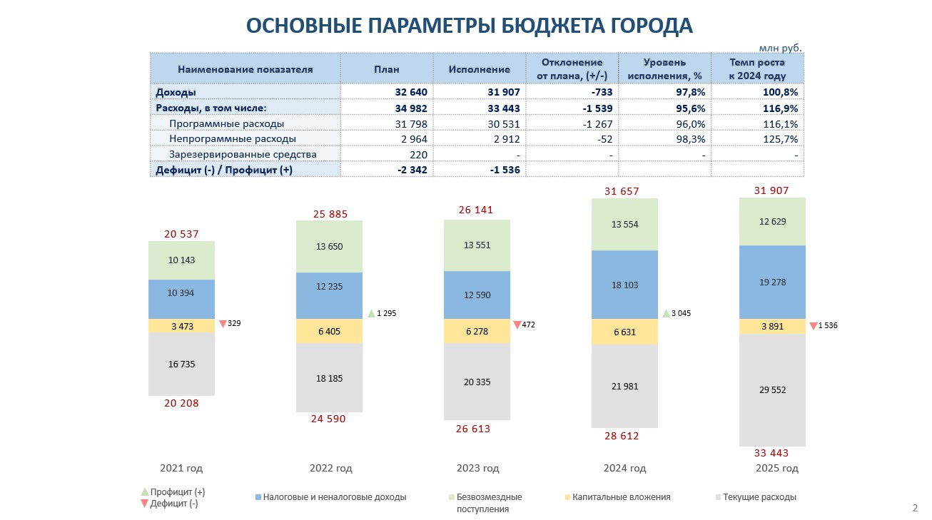 · Дефицит бюджета — 1 млрд 536 млн рублей (при плановом показателе в 2 млрд 342 млн рублей).