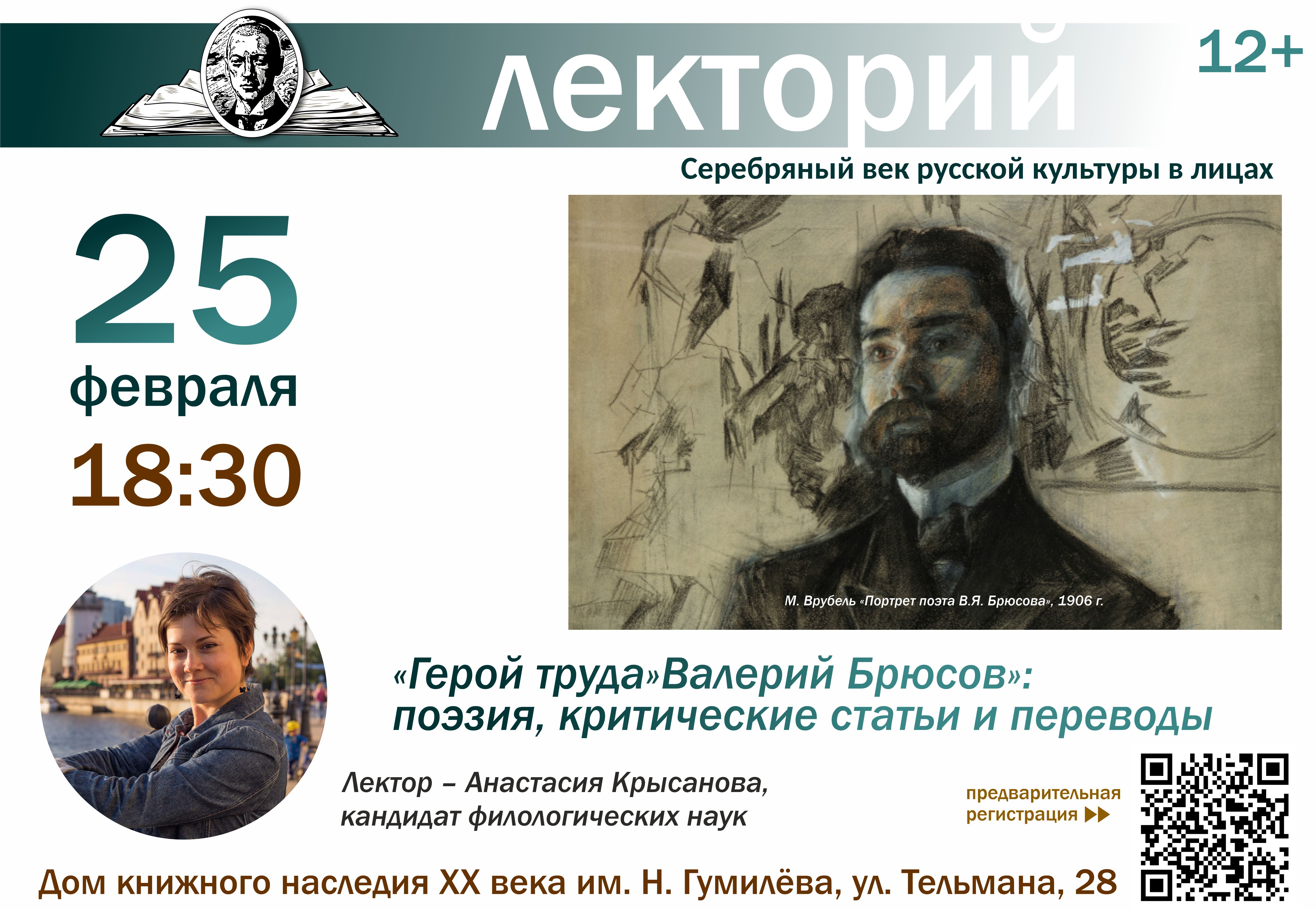 Лекция посвящена Валерию Яковлевичу Брюсову и называется «″Герой труда″ Валерий Брюсов». Лектор: Анастасия Крысанова, кандидат филологических наук.