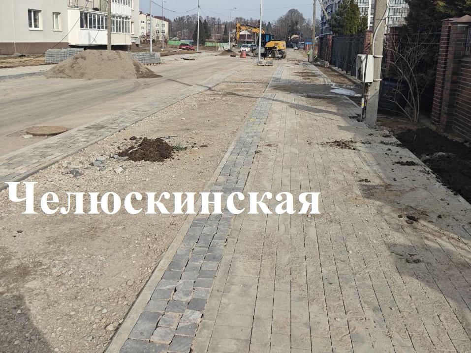 На соседней Челюскинской укладывают тротуарную плитку и мостят брусчаткой буферную зону между велодорожкой и тротуаром.
