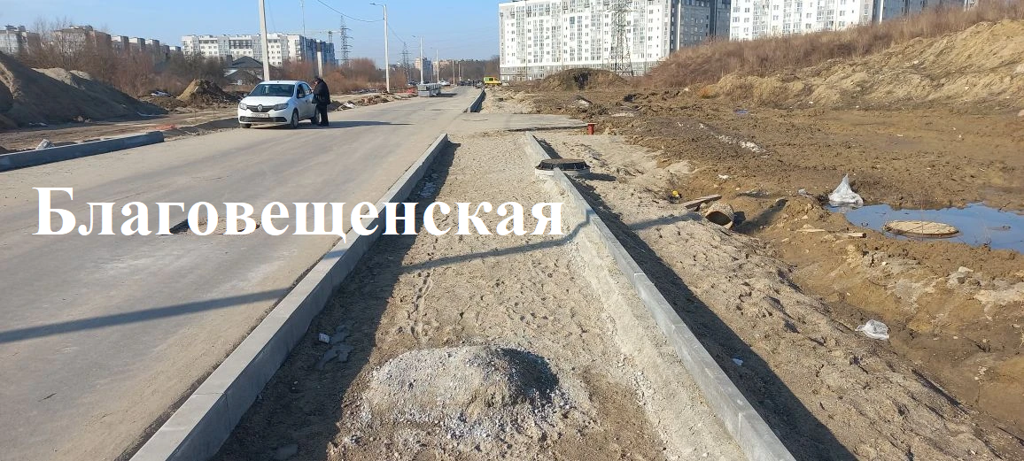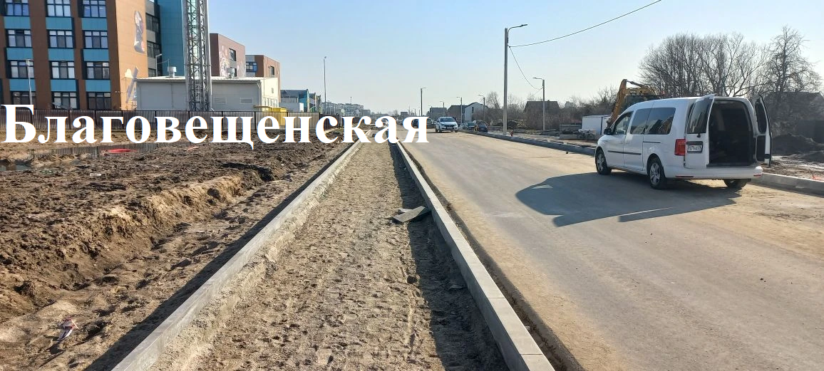 На строительстве Благовещенской монтируют бортовой камень; отсыпают песком парковочные места.