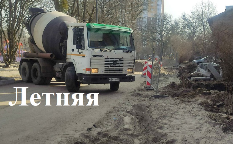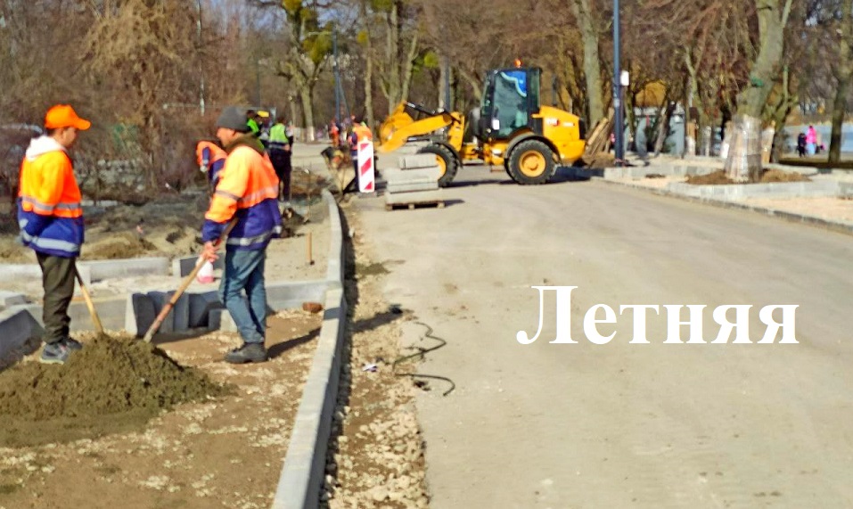 На Летней устраивают основание тротуара, парковок, заездов во дворы и подходы к подъездам по чётной стороне, бетонируют швы бортовых камней со стороны озера.