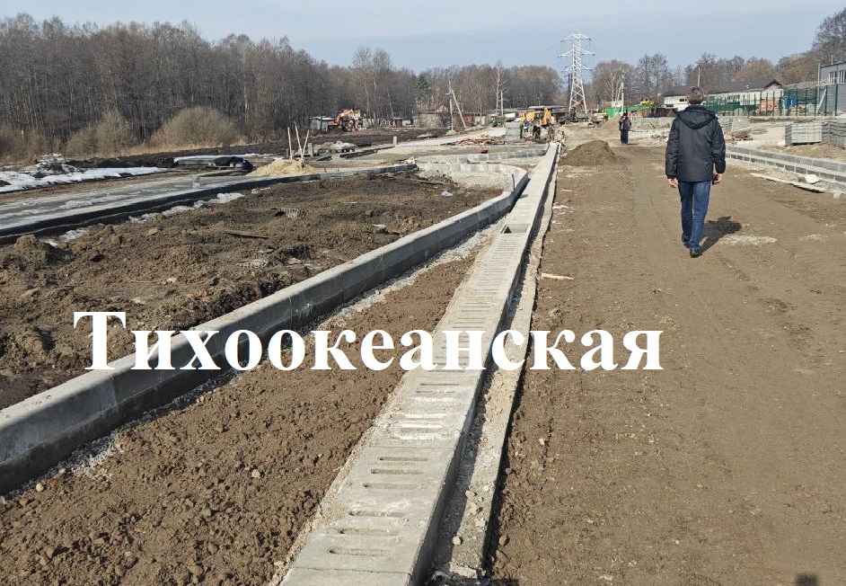 На Тихоокеанской продолжают установку бортовых камней, устройство песчаного основания тротуаров и укладку тротуарной плитки, а также монтаж лотков дождевой канализации.
