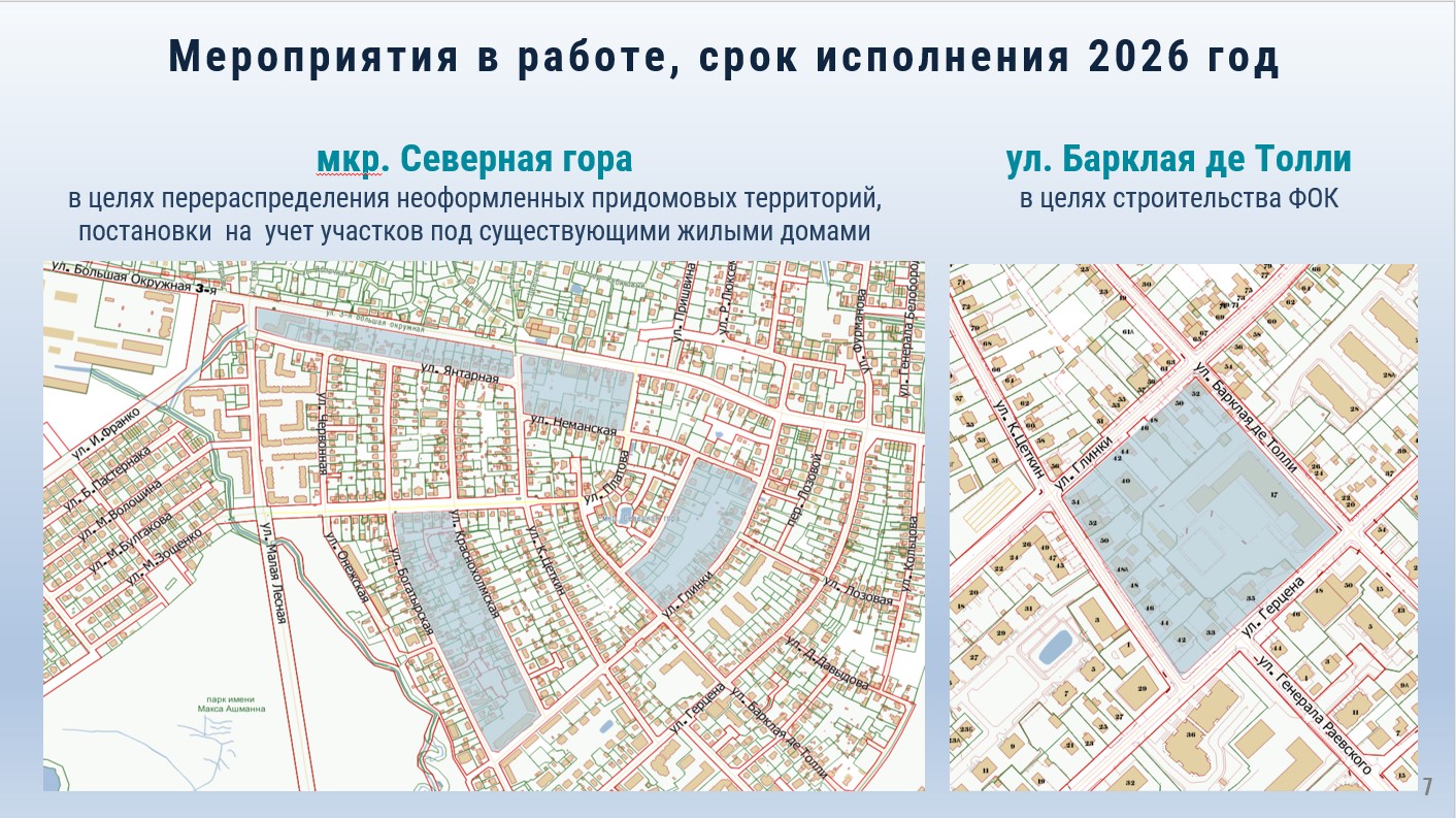 В работе находятся муниципальные контракты со сроком исполнения в 2026 году. На Правой набережной и улице Лесопильной планируется раздел земельных участков. На площади Василевского, 2-3 запланировано перераспределение территории в районе сквера. В микрорайоне Северная гора ведётся перераспределение неоформленных придомовых территорий и постановка на учёт участков под существующими жилыми домами. На участке от улицы Генерала Буткова до набережной Петра Великого планируется строительство улицы местного значения.