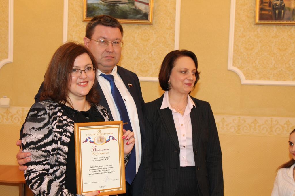 ДЮЦ «На Молодёжной» уже может похвастаться сотнями грамот, кубков и побед в конкурсах самых разных уровней и направлений. Александр Пятикоп вручил коллективу ДЮЦ грамоту «За большой вклад в реализацию региональной программы «Развитие культуры в Калининградской области».