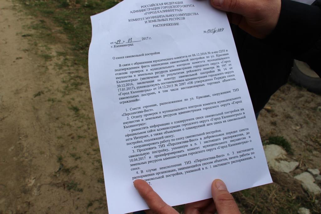 «Ну, вот уже два часа мы простояли, пока какой-то человек, представитель Гоменюка, вез какие-то документы, чтобы доказать свои права на этот участок. В итоге это отказались вообще какие-то бумаги, которые ничего не доказывают. Учитывая, что у нас на руках распоряжение, подписанное заместителем главы администрации Калининграда, председателя комитета муниципального имущества и земельных ресурсов Александра Зуева о сносе данных незаконных построек, мы приступили к выполнению своей работы – демонтажу», – объяснил Александр Романов, представитель МБУ «Гидротехник».
