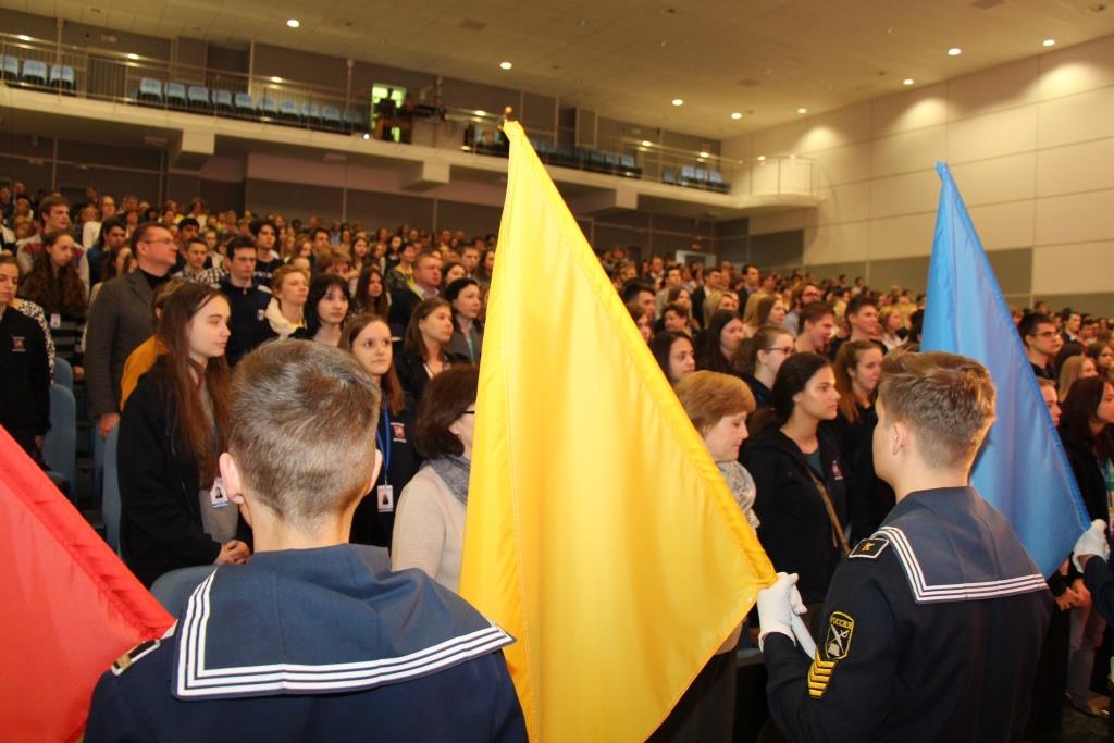Флаги всех этих республик и областей, а также Санкт-Петербурга и Москвы вынесли на сцену наши кадеты, а зал овациями встречал каждую делегацию: и совсем небольшие, некоторые были представлены одним-двумя школьниками, и многочисленную, как, например, команду Подмосковья.