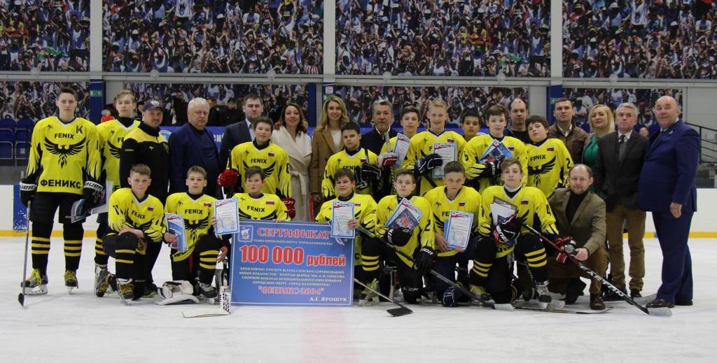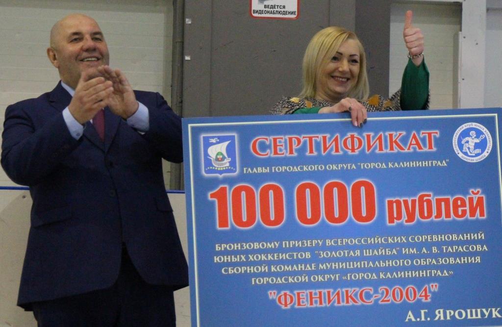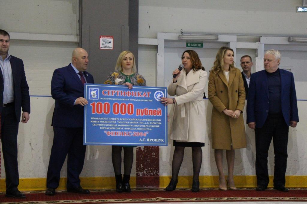 Обращаясь к юным хоккеистам, Анна Апполонова, поздравила их с выходом в призёры первенства, отметив, как важен их результат для молодого калининградского хоккея и в целом для спортивного престижа нашего города, а затем от лица главы Калининграда Александра Ярошука вручила команде сертификат на 100 тысяч рублей.
