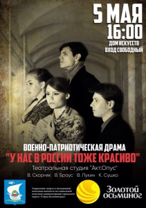 5 мая, в 16 часов, в малом зале Дома искусств театральная студия «Акт.Опус», созданная на базе МАУ КМКДЦ «Золотой осьминог» представит короткую военно-патриотическую драму по рассказам М.Машковой о блокадном Ленинграде - "У нас в России тоже красивоНачало мероприятия - 16.00. Вход свободный.