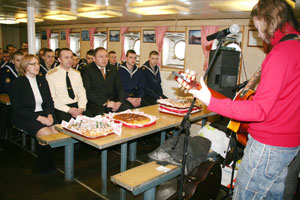 В этот раз вместе с депутатом на боевой корабль приехали юные артисты. На просьбу управления по делам молодёжи администрации Калининграда с готовностью откликнулись студентки и старшеклассницы из вокально-эстрадного коллектива «Класс» и исполнители бардовской песни, объединённые в ансамбль «Бандероль». Они превратили кают-компанию в концертный зал, в котором собрались все офицеры, мичманы, контрактники и матросы-срочники, свободные от вахты. Любимые песни в исполнении ровесников и ровесниц, а затем чаепитие с пирогами стали доброй передышкой в суровых морских буднях.
