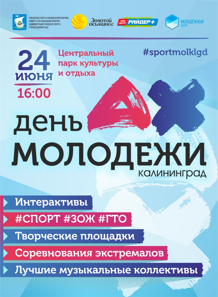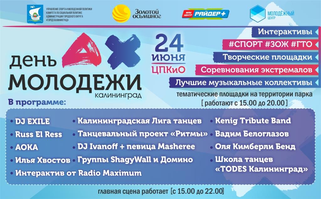 Традиционно самые массовые мероприятия, посвящённые Дню молодёжи, проводятся в последние выходные июня. В этом году самым ярким, творческим и молодежным днем для Калининграда станет 24 июня.