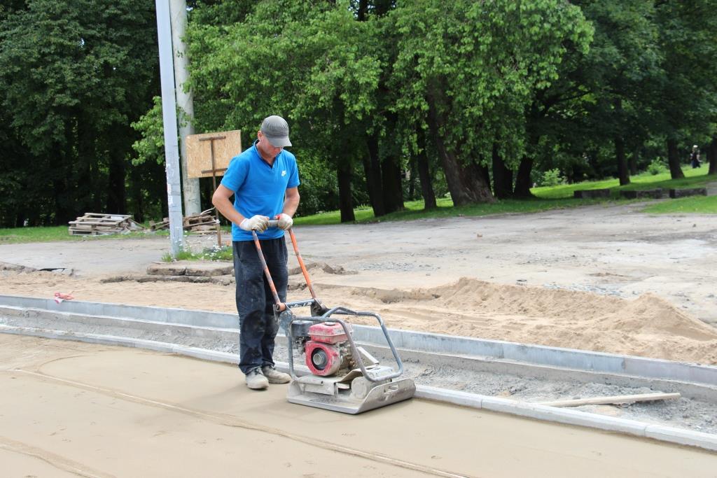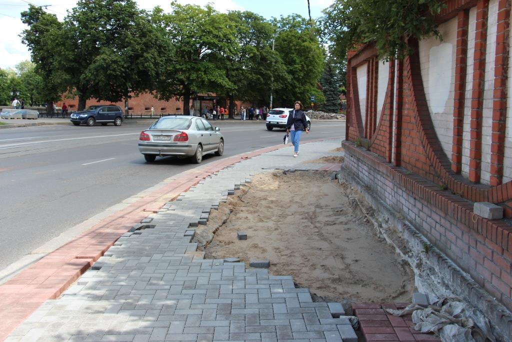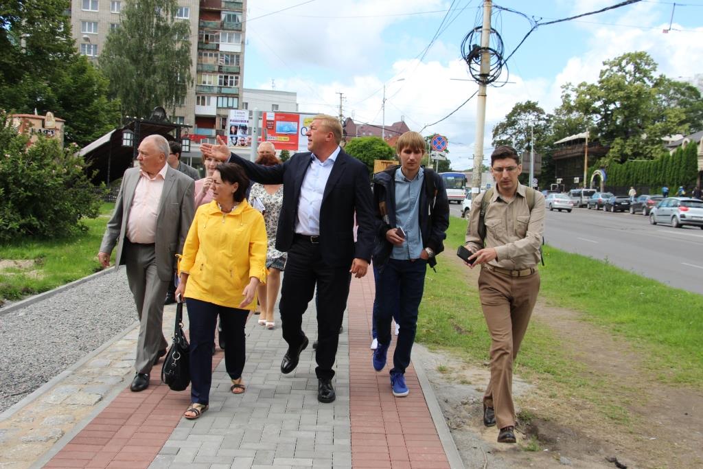 Глава города, проверив, как идет ремонт тротуаров у Музея янтаря и на другой стороне улицы Черняховского от площади Василевского до ул. Сергеева, отметил, что стоит найти какое-то стилевое единство для обустройства пешеходных дорожек с помощью плитки.