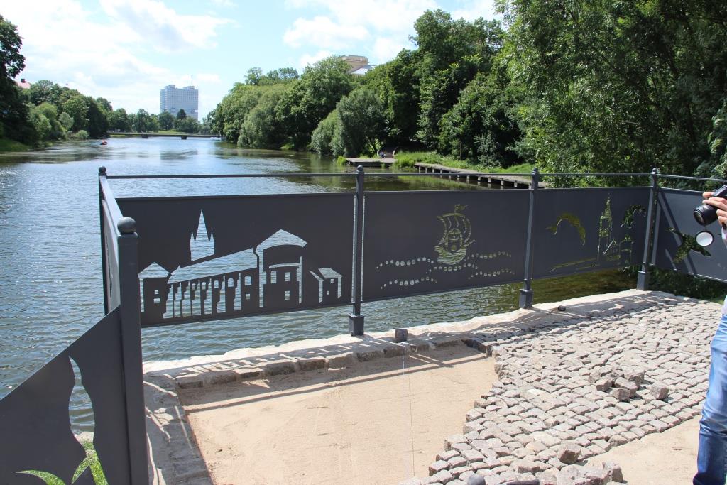 На дамбе, которую горожане воспринимают больше как переход с одного берега пруда на другой, также установлено железное резное ограждение. Оно служит для безопасности людей, двигающихся по дамбе.