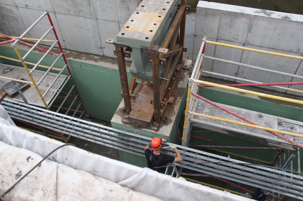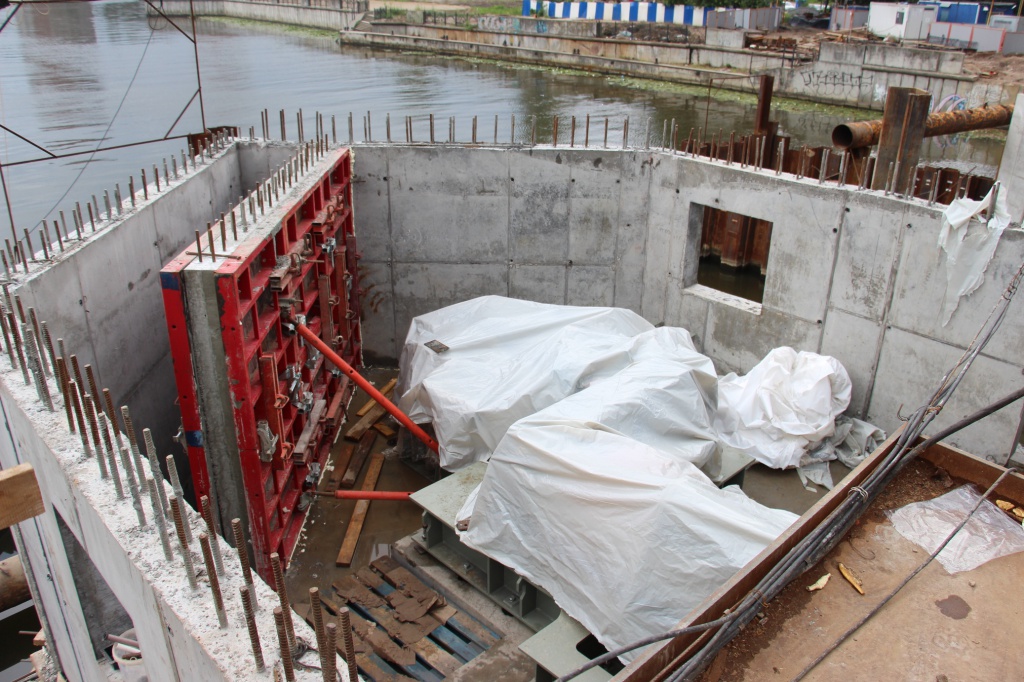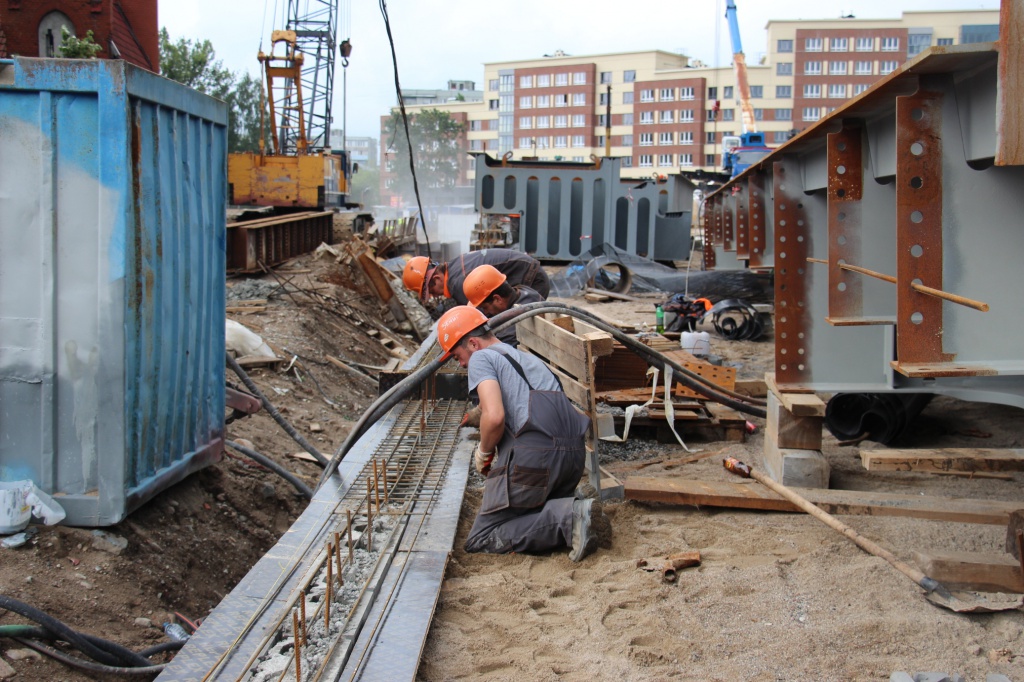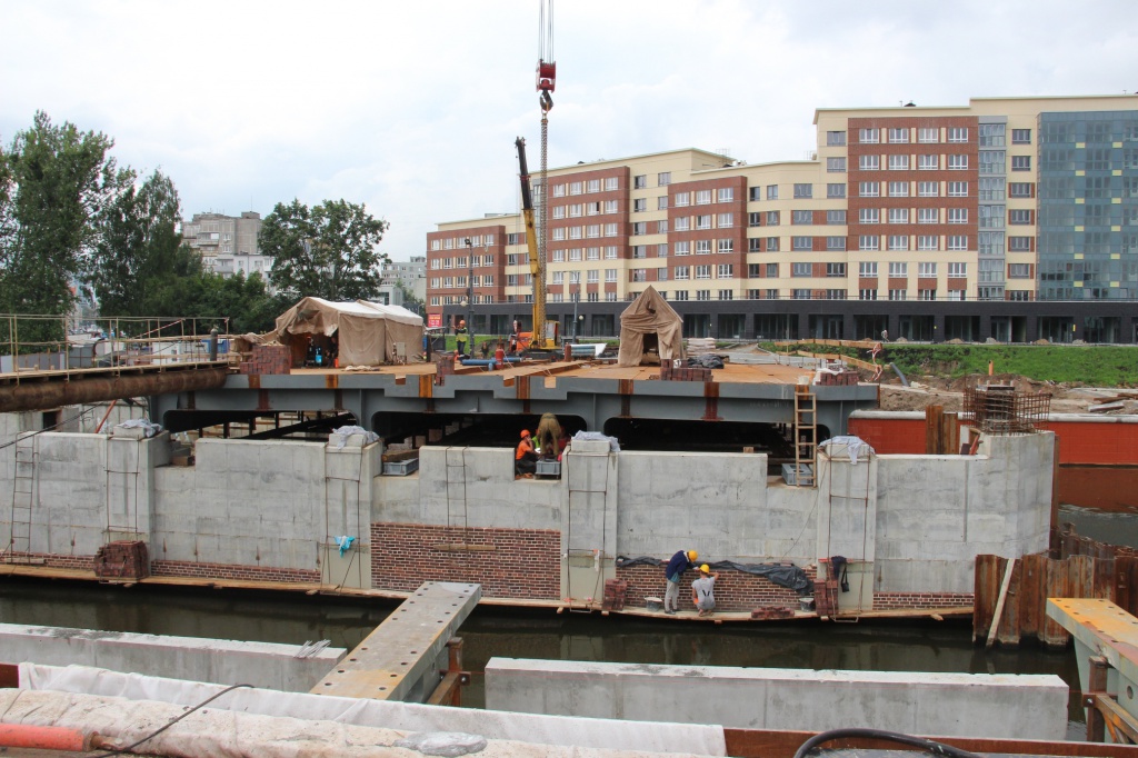 Сейчас на мосту Высоком полным ходом идет монтаж разводного механизм, который позволит поднимать части пролета для прохождения судов. На пролетных строениях ведутся сварочные работы, на подпорных стенках осуществляется армирование. Опоры моста облицовывают красным кирпичом.