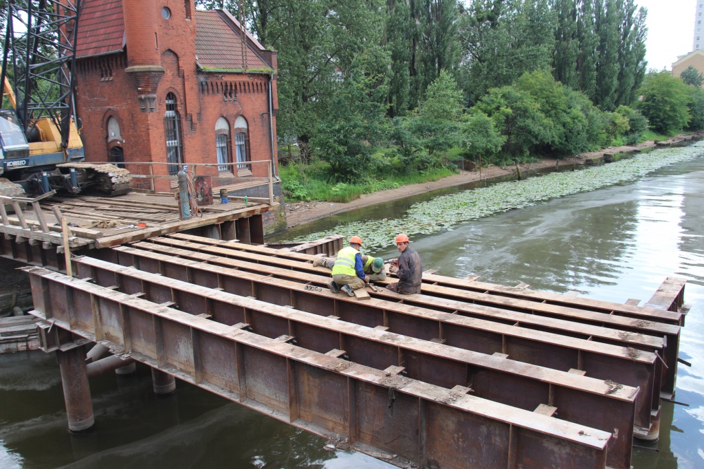 За ненадобностью полностью разобран первый технологический мост, идет разборка второго. Свою функцию они выполнили на этапах демонтажа старых конструкций Высокого и строительстве новых опор моста, монтаже несущих балок и обустройстве ортотропных плит с обоих сторон Преголи.