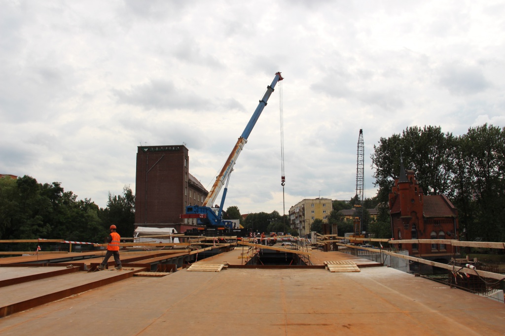 На Высоком же мосту новенькие серо-красные разводные механизмы уже смонтированы, подведены к ним и все необходимые инженерные коммуникации для будущей работы механизмов. Сейчас завершается монтаж мостового пролета для прохождения под мостом судов.