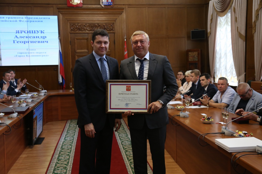 За достигнутые трудовые успехи, многолетнюю добросовестную работу и активную общественную деятельность почетной грамотой Президента РФ награжден глава городского округа «Город Калининград» Александр Ярошук.