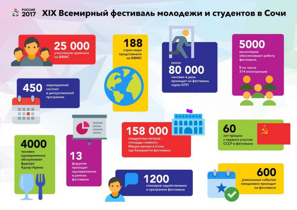 Основные программные мероприятия Фестиваля прошли с 14 по 22 октября в Сочи, помимо этого 2000 иностранных гостей посетили регионы и познакомились с культурой и историей нашей страны, гостями Калининградской области стали 200 молодых людей, для которых была подготовлена насыщенная и разнообразная трехдневная программа.