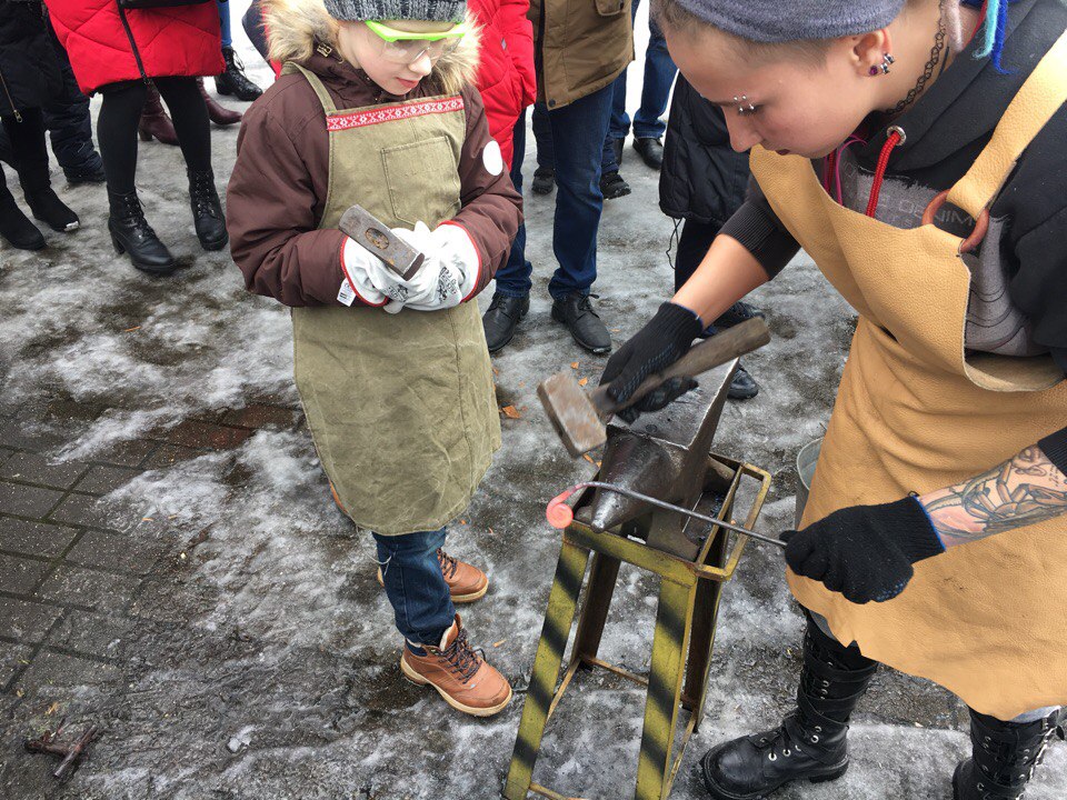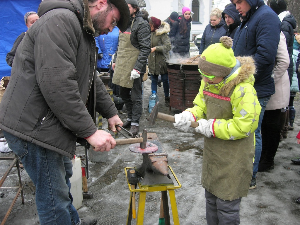 Дети соревновались в перетягивании каната и водили хороводы, пока их мамы боролись за приз в шуточном дамском чемпионате по забиванию гвоздей, выкованных Гильдией кузнецов Калининграда, развернувшей на Кузнечном подворье.