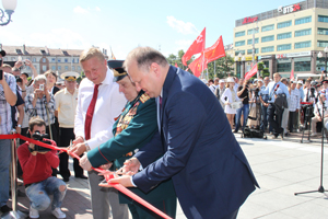 После возложения губернатор Калиинградской области Николай Цуканов и глава города Александр Ярошук приняли участие в открытии памятного знака «Орден Победы» на Триумфальной колонне.