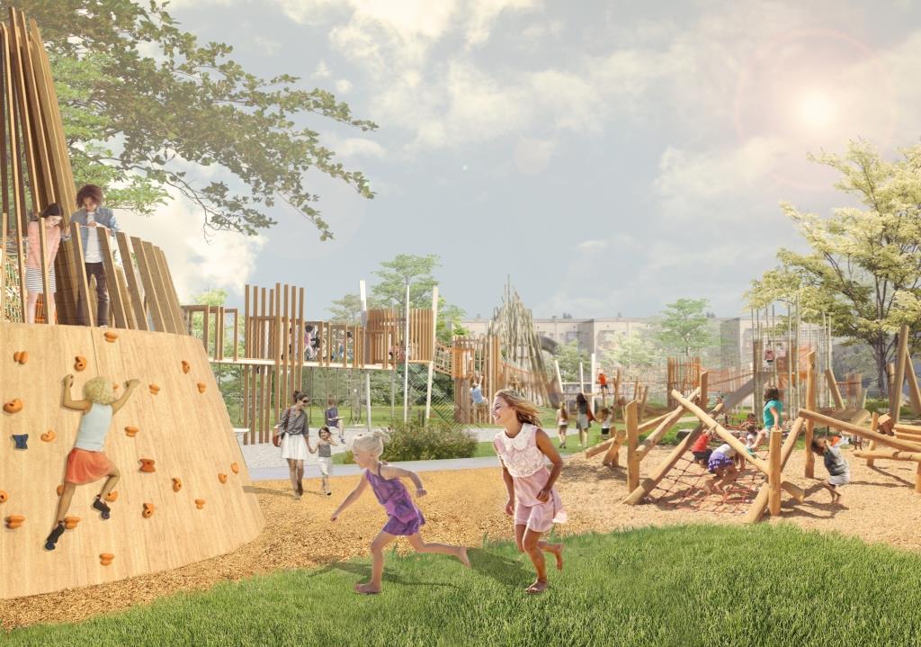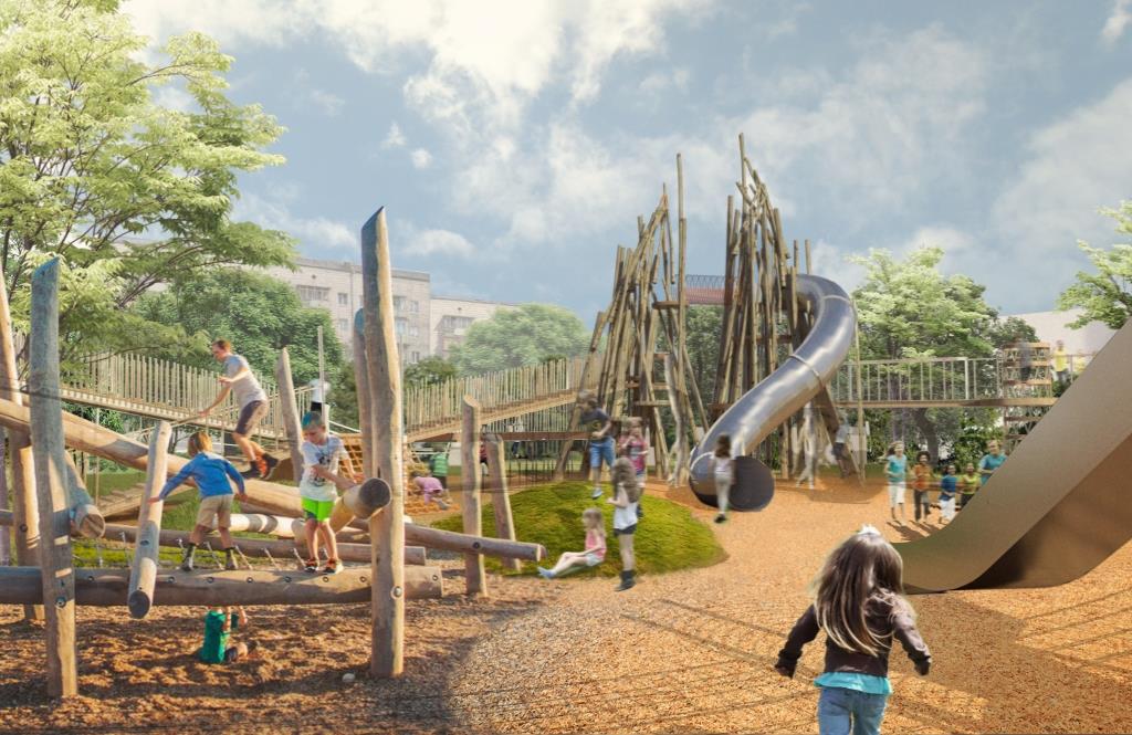 В сквере на бульваре Рокоссовского архитекторы из бюро «Чехарда» предлагают создать детский городок в виде крепости. Этот проект включает в себя песочницу, подвесные лестницы и качели, а также мини-скалодром для подростков.