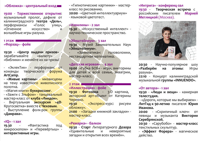 Участников ждёт виртуальная экскурсия «4D-Кругосветка» по предводительством гида Че, встреча с искусственным интеллектом, литературные конкурсы и аукционы, творческая встреча с популярным российским автором Марией Метлицкой (Москва), концерт музыкальной группы «INNUENDO», научно-популярное шоу «Разберём на атомы» (партнёр — Информационный центр по атомной энергии), телестудия «Люди и вещи» — запись историй посетителей, мастер-классы «Эффект Форера», «Сарубобо», «Зажги с Эльфом» (партнёр — клуб «Линдон»), литературная сессия «Самиздат-Самчитат», интеллектуальные и ролевые игры, воображариум «Миражи японских миров», квартирник «Обратная сторона луны: наша советская молодость», детская игровая комната «Губка БОБ» и ещё множество интерактивов и игр на логику, мышление и быстроту реакции.