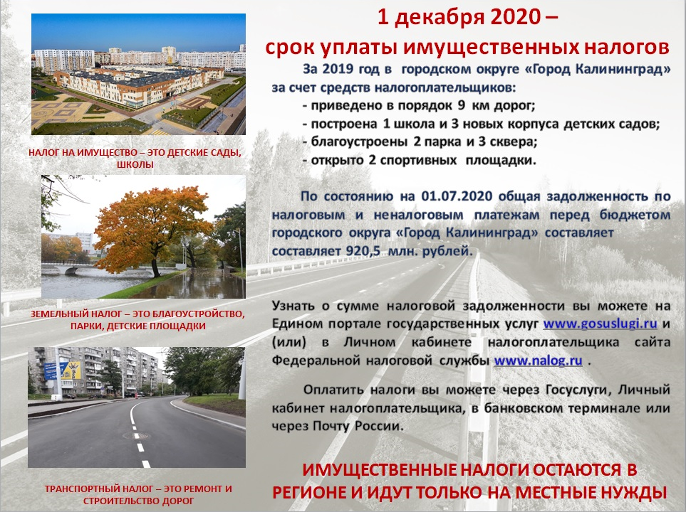 Срок уплаты имущественных налогов - 1 декабря 2020 года. Правительство Калининградской области и администрация города обращаются к налогоплательщикам с напоминанием своевременно оплатить установленные налоги.