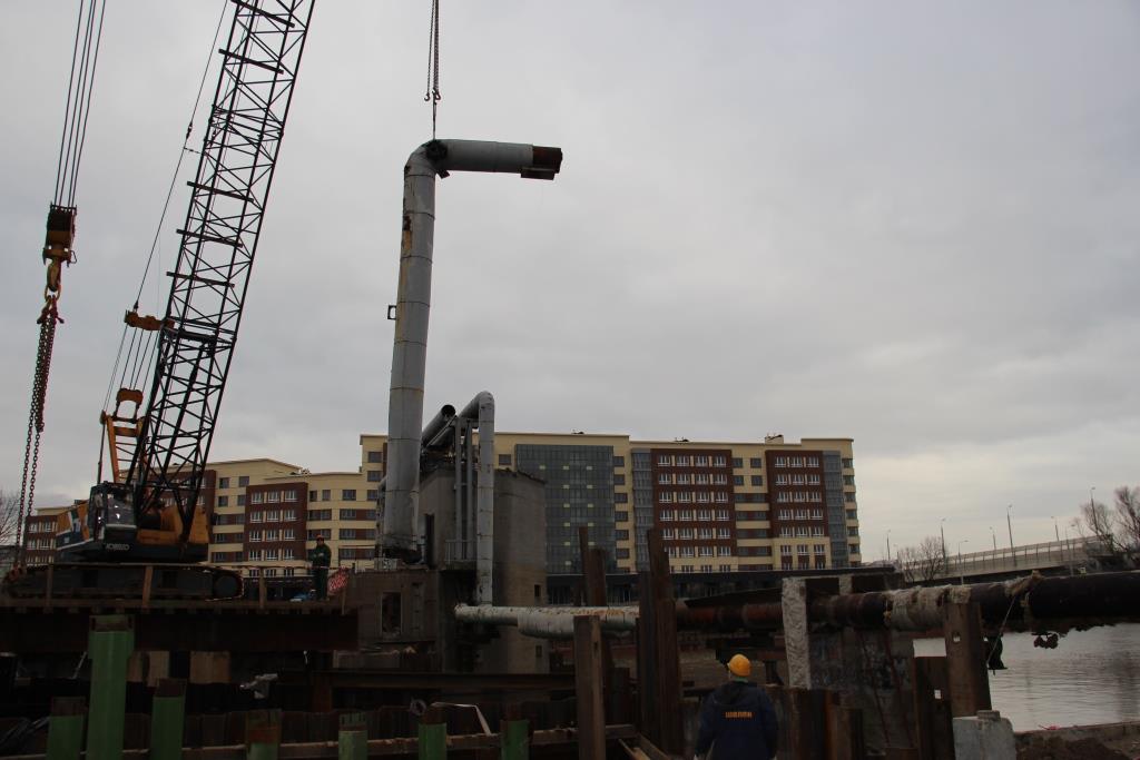 Сегодня мостостроители приступили к демонтажу старой теплоцентрали, которая в своё время была проложена по конструкциям моста и ещё недавно обеспечивала теплом жителей Острова. Многотонная теплотрасса не давала возможности продолжать разборку ветхих элементов и тормозила работу.