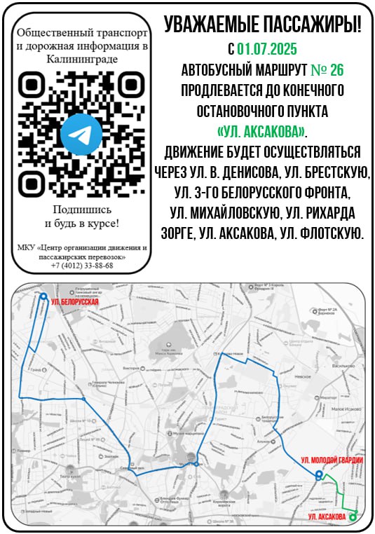 Маршрут №26 продлевается до конечной остановки «ул. Аксакова» - с кольца на Маршала Покрышкина по улицам Виктора Денисова, Брестской, 3-го Белорусского фронта, Михайловской, Рихарда Зорге, Аксакова, Флотской - с разворотом на новом кольце у школы №56 и возвращением по улицам микрорайона «Восток» на Молодой гвардии и свой маршрут.