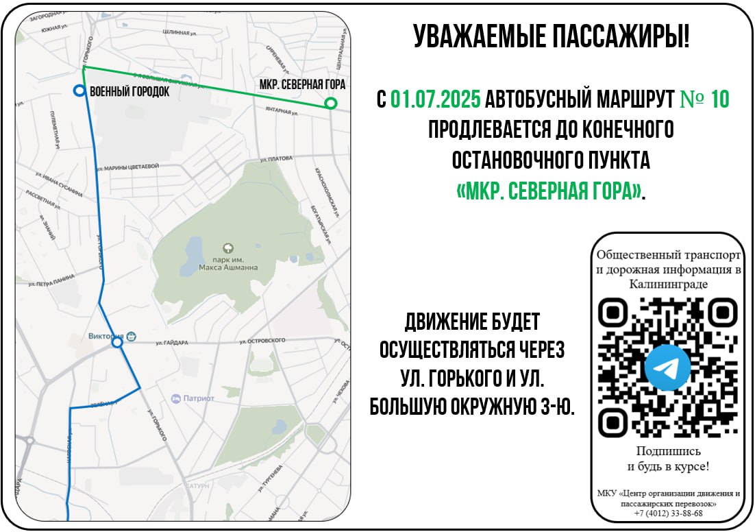 Маршрут №10 пойдёт до конечной остановки «Северная гора». Автобусы направятся с Горького по 3-й Большой окружной с разворотом на остановке «Северная гора», далее на Горького и по прежней схеме движения.