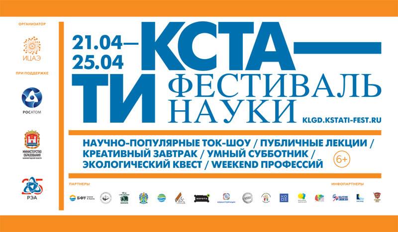 В этом году фестиваль науки «Кстати. Точки роста» пройдёт в Калининграде с 21 по 25 апреля. В рамках фестиваля на разных площадках можно будет услышать лекции «Мечтать не вредно: 10 выдумок фантастов, которые ученые воплотили в жизнь» (читает научный журналист Ирина Якутенко), «Тигр глотает крокодила: разговор о коммуникациях» (читает Андрей Тимонов, директор департамента информации и общественных связей АО «Концерн Росэнергоатом»), «Это наш город! Стрит-арт как возможность городских изменений» (читает Оксаны Запорожец, кандидат социологических наук), «Парадокс мидихлориан или вся правда о „Звездных войнах“» (читает Валериан Юров – доцент-исследователь Физико-технического института БФУ им. Канта)