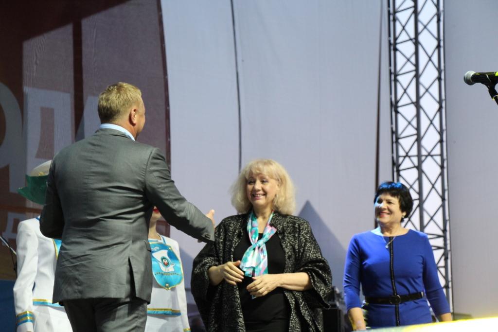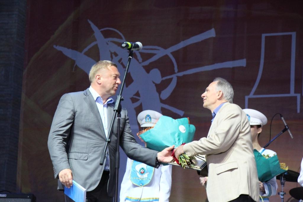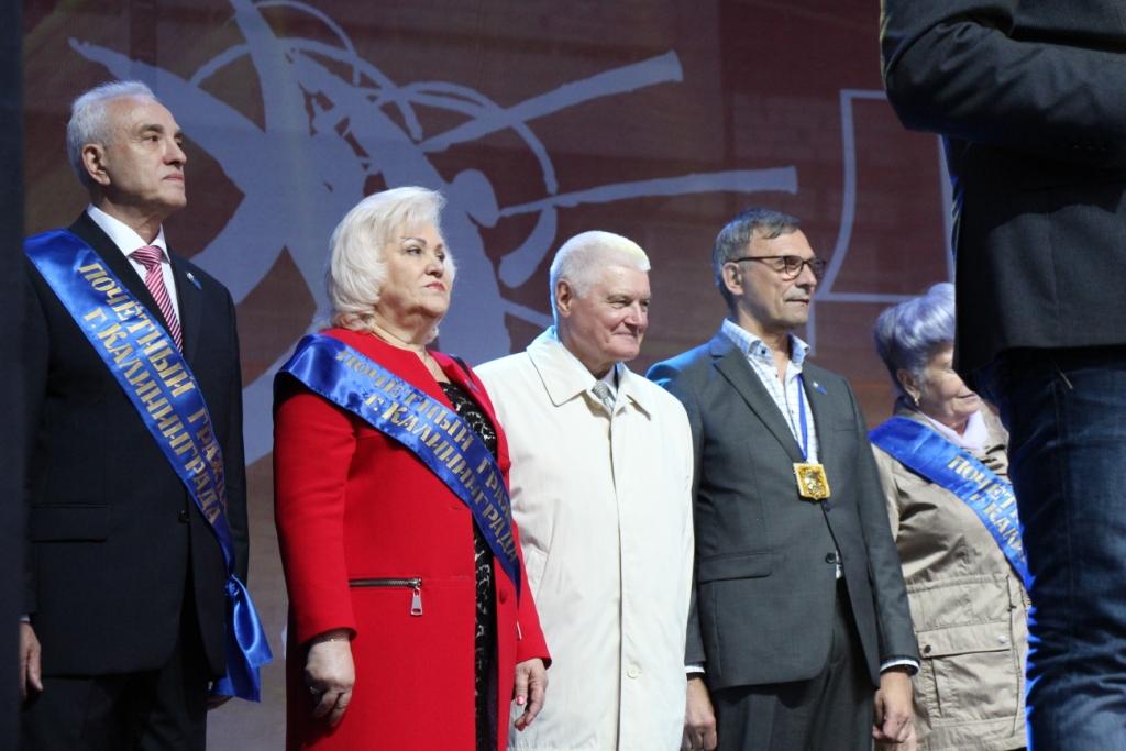 Глава Калининграда Александр Ярошук и Андрей Кропоткин под аплодисменты почётных граждан на сцене и многотысячной толпы калининградцев вручили Борису Затопляеву знаки отличия.