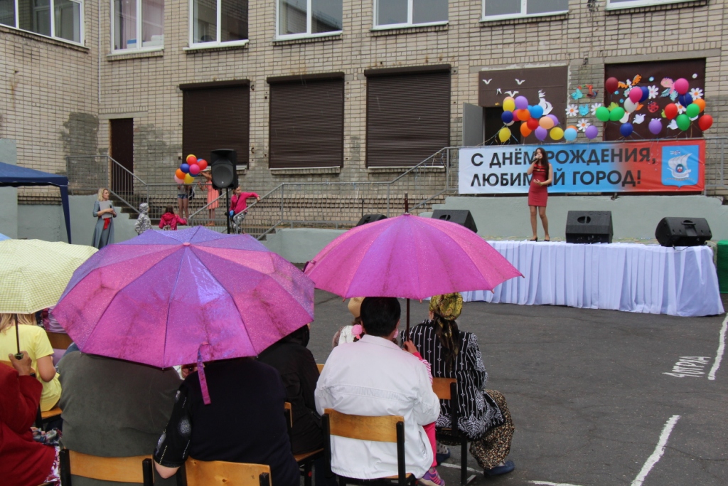 Мероприятия Дня города в Прибрежном, несмотря на дождь, состоялись не только у молодёжного центра, но и на школьном дворе, где прошёл концерт, церемония чествования активистов, спортивные состязания, игры, угощение и народные гуляния.