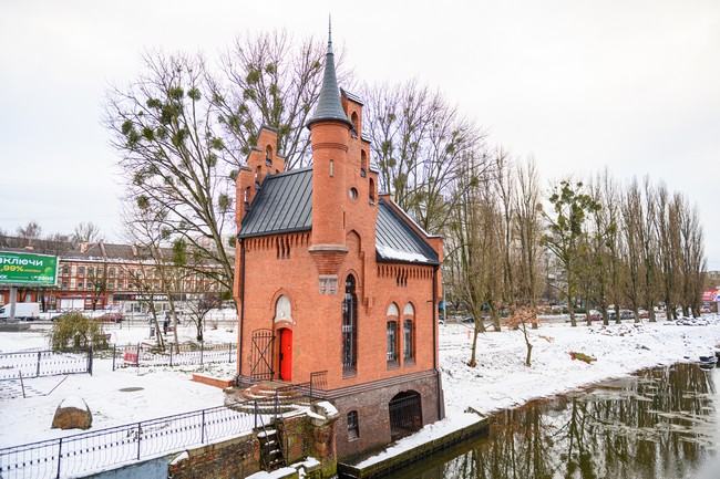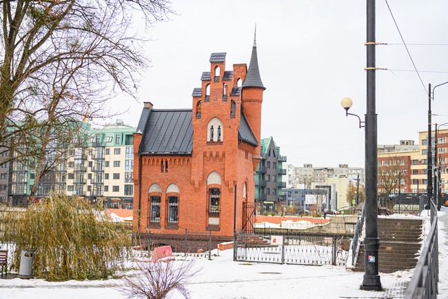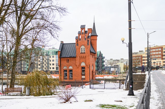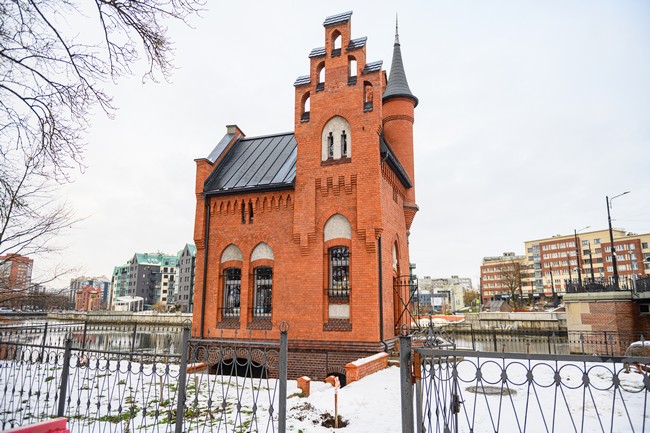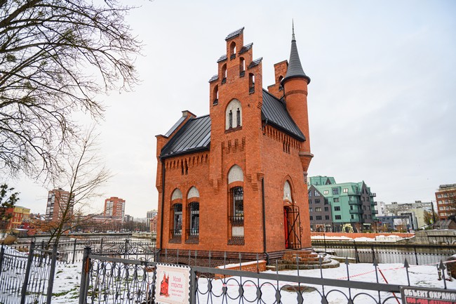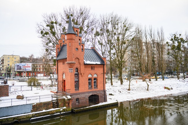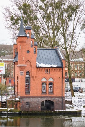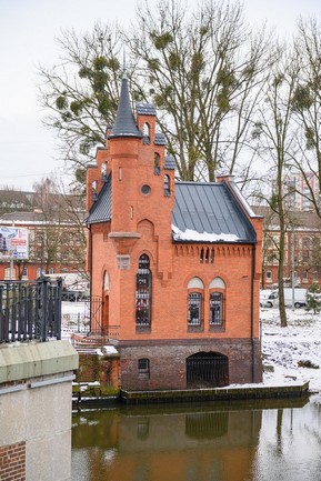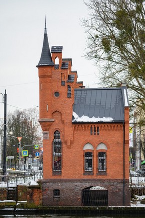 Здание подъёмных механизмов Высокого моста (или, как его ещё называют, Дом смотрителя) построено в комплексе с новым разводным Высоким мостом в 1899 году. В постройке неоготического стиля размещались подъёмные механизмы, гидравлические аккумуляторы и насосы. Размещался ли там же сам смотритель ― точно неизвестно.