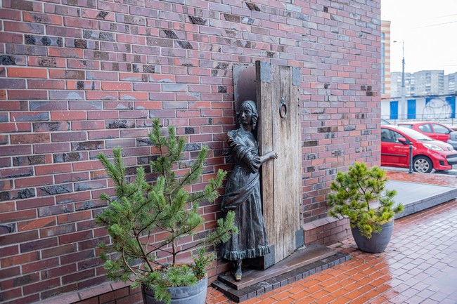 Справа ― женщина в пышном платье, которая выглядывает из-за деревянной двери. Это скульптура «Трактирщица, зазывающая гостей». Слева ― старый моряк с обезьянкой на плече, он сидит на скамейке буквально у самого входа. Обе скульптуры принадлежат авторству художника Александра Бема, а их идею придумал Павел Фёдоров ― генеральный директор компании, которая вела стройку Рыбной деревни.