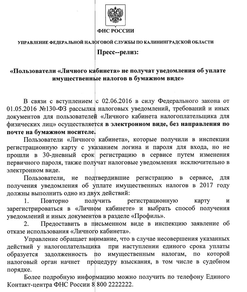 Пользователи "Личного кабинета" не получат уведомления об уплате имущественных налогов в бумажном виде