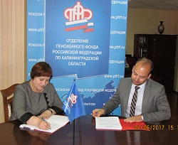 Калининград, 1 июня 2017 года. Сегодня, 1июня, состоялось торжественное подписание договора о порядке взаимодействия между публичным акционерным обществом «БАНК «САНКТ-ПЕТЕРБУРГ» и Отделением Пенсионного фонда России по Калининградской области при доставке пенсий, выплачиваемых ПФР. Помимо договора одновременно было заключено Соглашение об электронном взаимодействии.