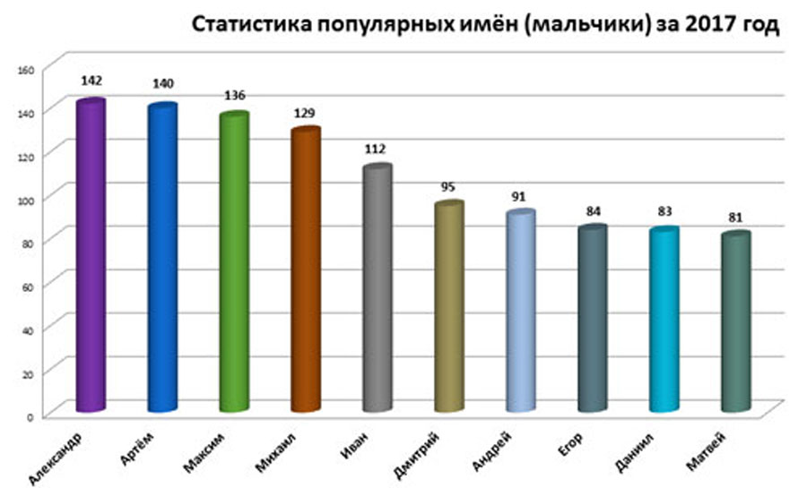 Среди женских имен в ноябре месяце самыми популярными стали Анна, София, Елизавета, Ева, Аделина, Алиса. Мальчиков родители предпочитали называть – Михаил, Лев, Александр, Дмитрий, Артём, Даниил.